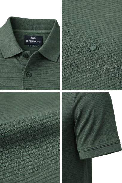 Una polo dallo stile pulito e raffinato, ideale per chi ama un look minimal ma curato. Il colore verde con micro righe tono su tono dona profondità al tessuto e un’eleganza discreta, perfetta per ogni occasione.