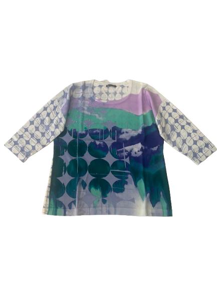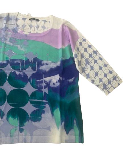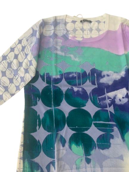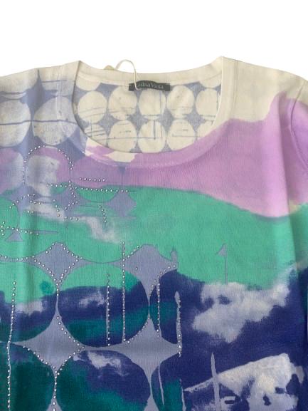 Maglia donna Luisa Viola in filo di viscosa manica 3/4 girocollo con stampa multicolore arricchita da lavorazione con strass