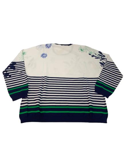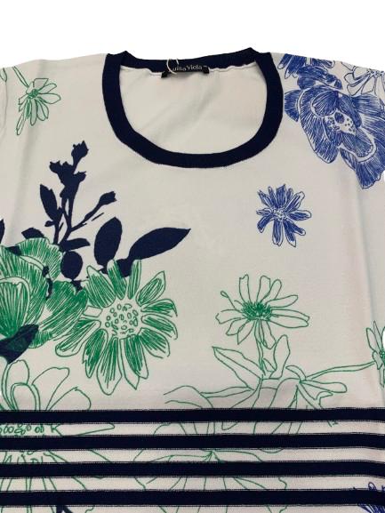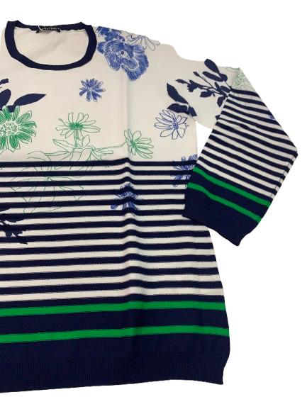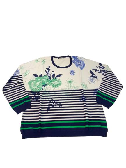 Maglia donna Luisa Viola in filo di viscosa manica lunga girocollo con profilo blu e stampa multicolore su fondo bianco