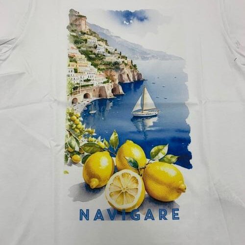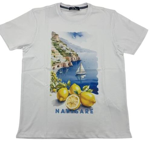 La T-shirt uomo Navigare rende omaggio alla bellezza iconica della Costiera Amalfitana, con una stampa ispirata ai suoi celebri limoni e al mare cristallino. Un capo che racconta l’estate italiana, il profumo degli agrumi e lo stile senza tempo del Mediterraneo.