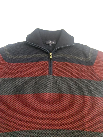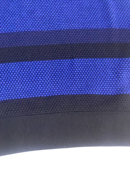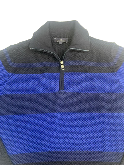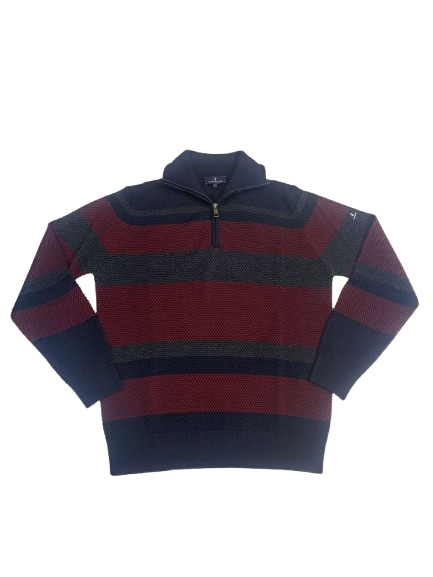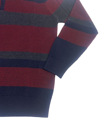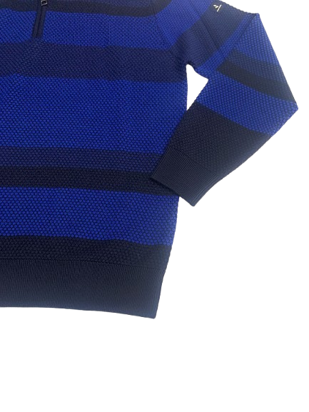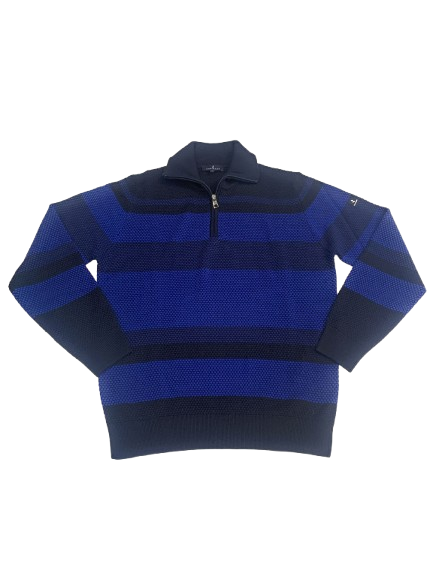 MAGLIONE UOMO NAVIGARE COLLO ALTO CON CERNIERA CON FANTASIA A FASCE SU FONDO BLU LOGO SUL BRACCIO E LAVORAZIONE PUNTO PALLINO