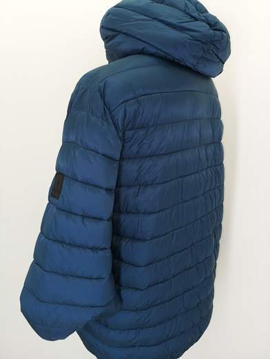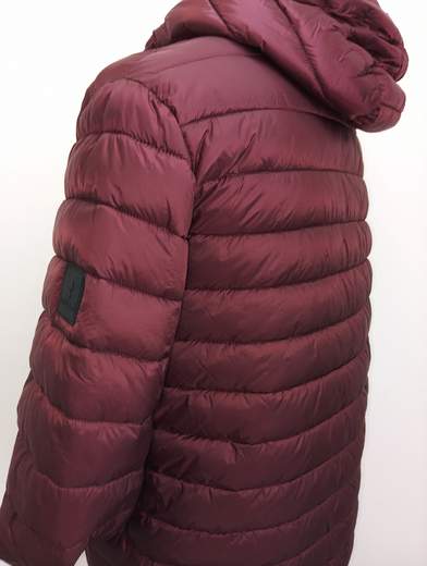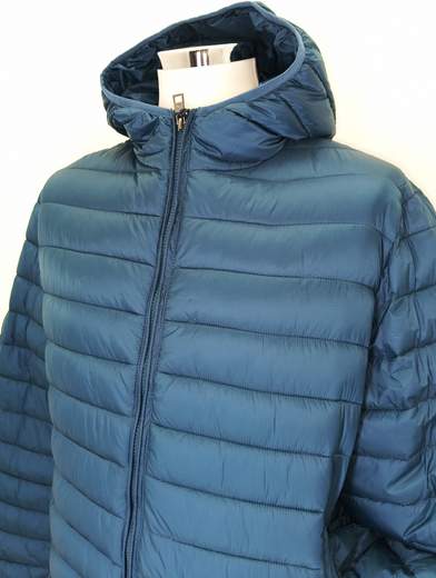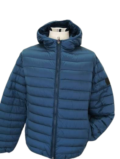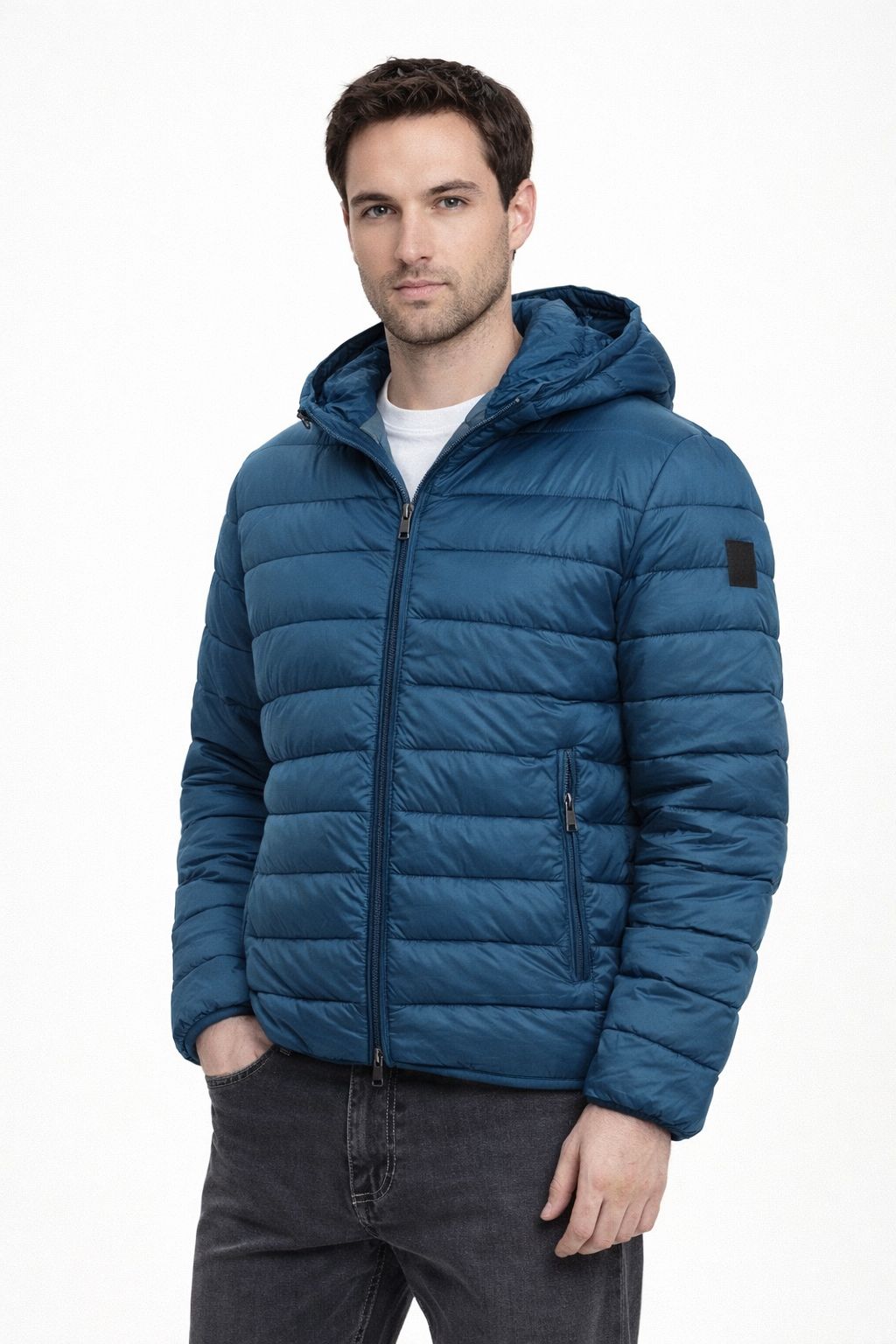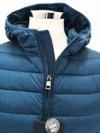 Piumino uomo 100grammi in eco-piuma con effetto lucido cappuccio integrato cerniera doppio cursore e tasche chiuse con zip logo sul braccio