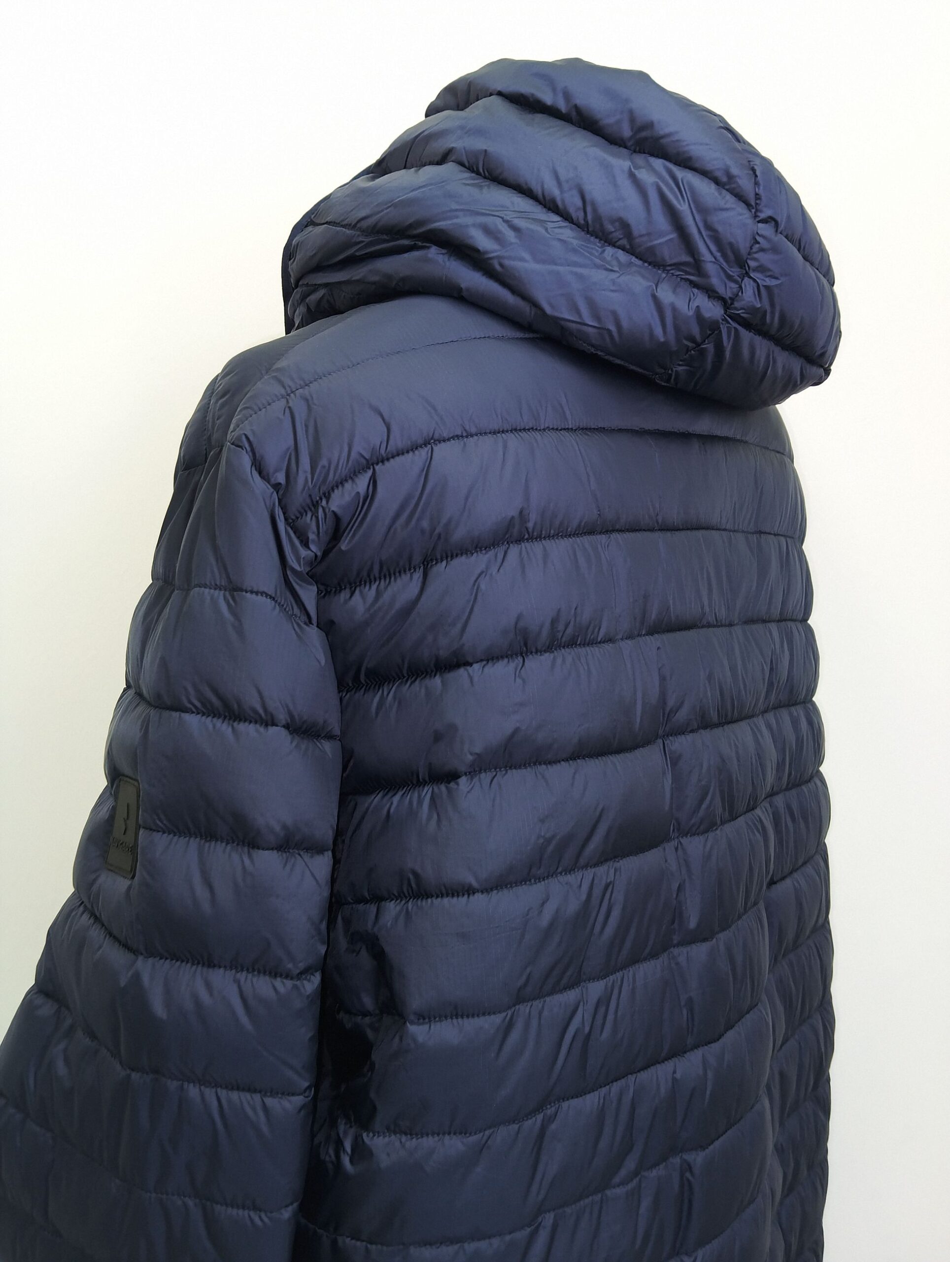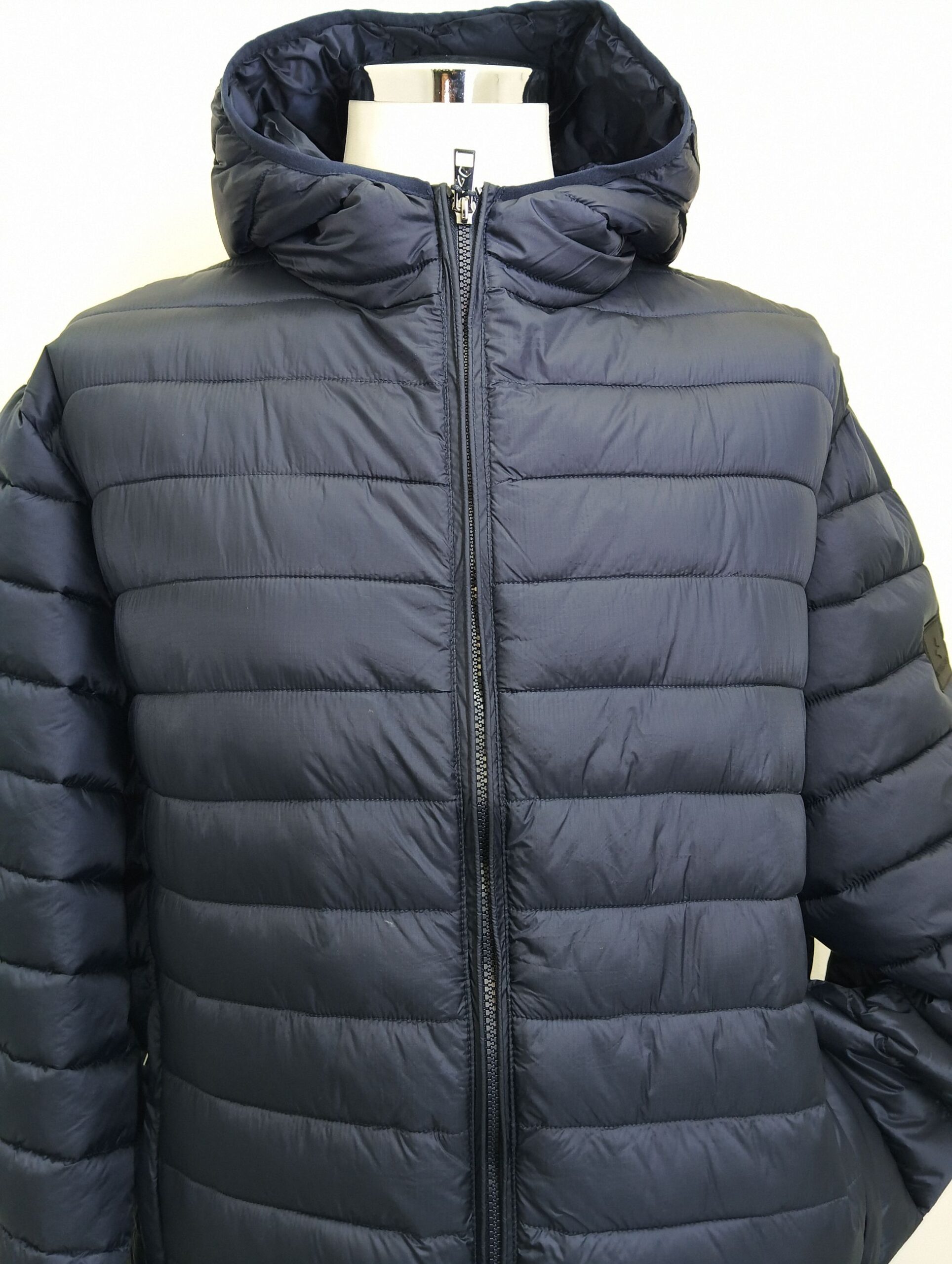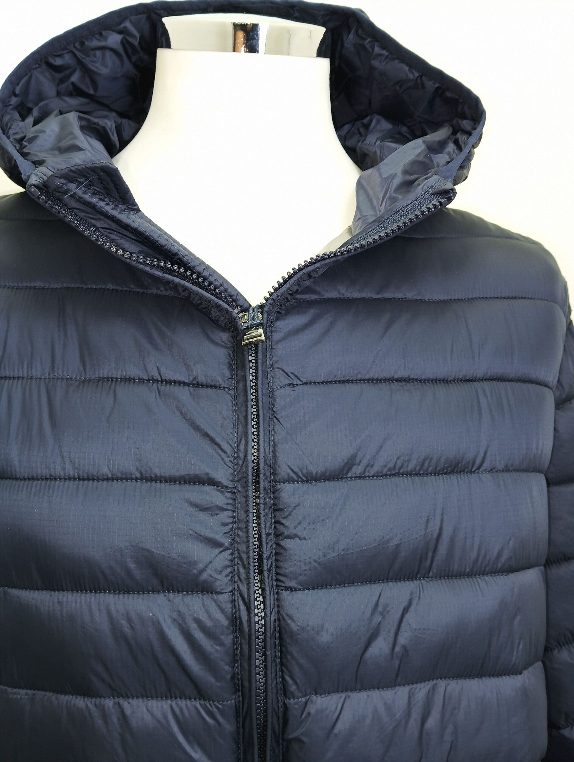 Piumino uomo 100grammi in eco-piuma con effetto lucido cappuccio integrato cerniera doppio cursore e tasche chiuse con zip logo sul braccio