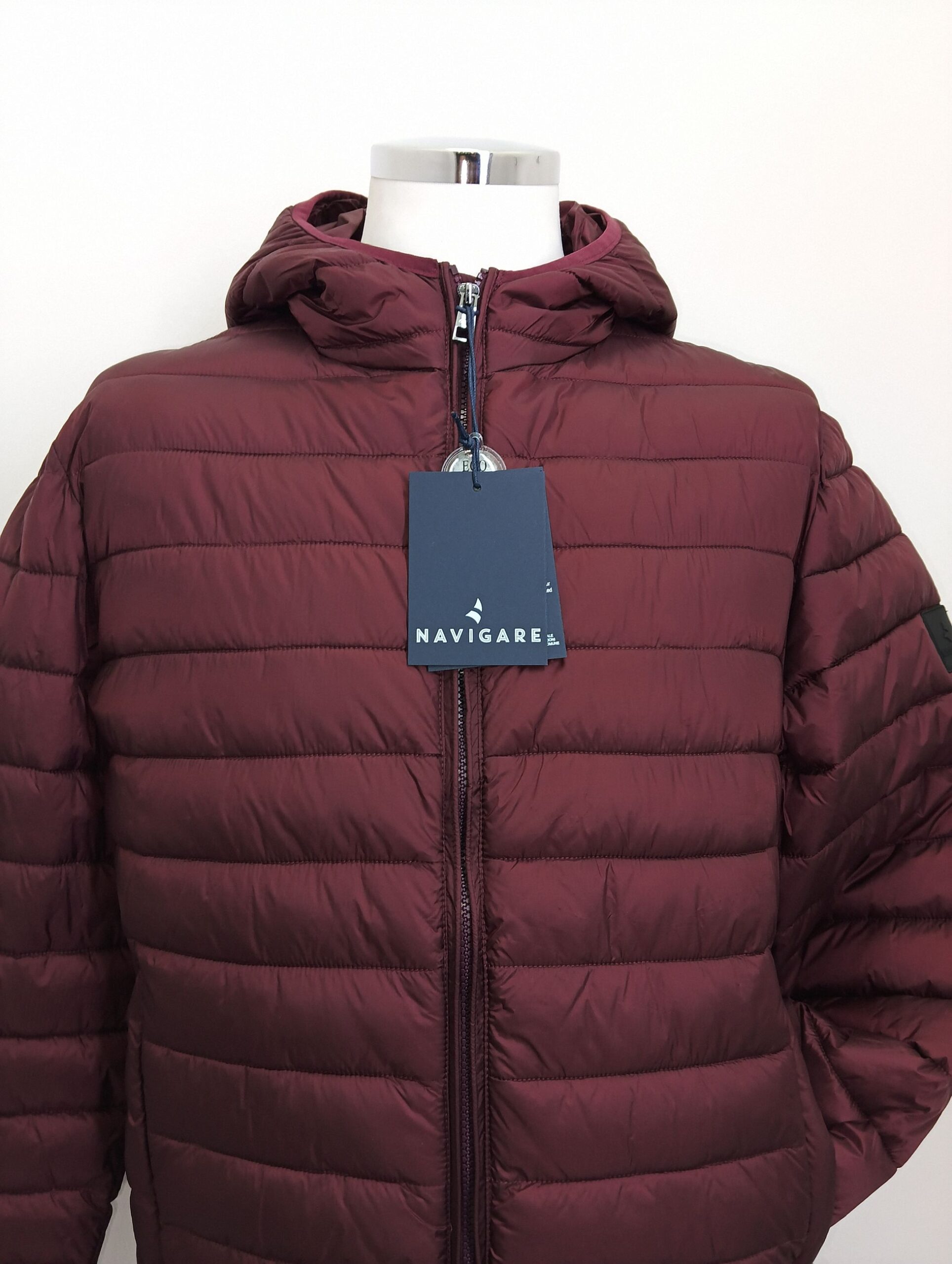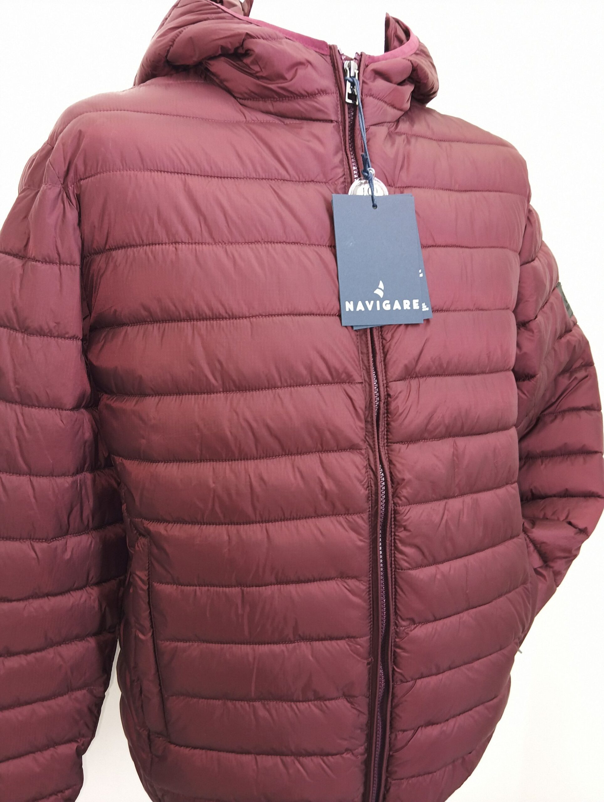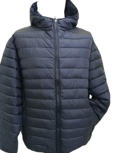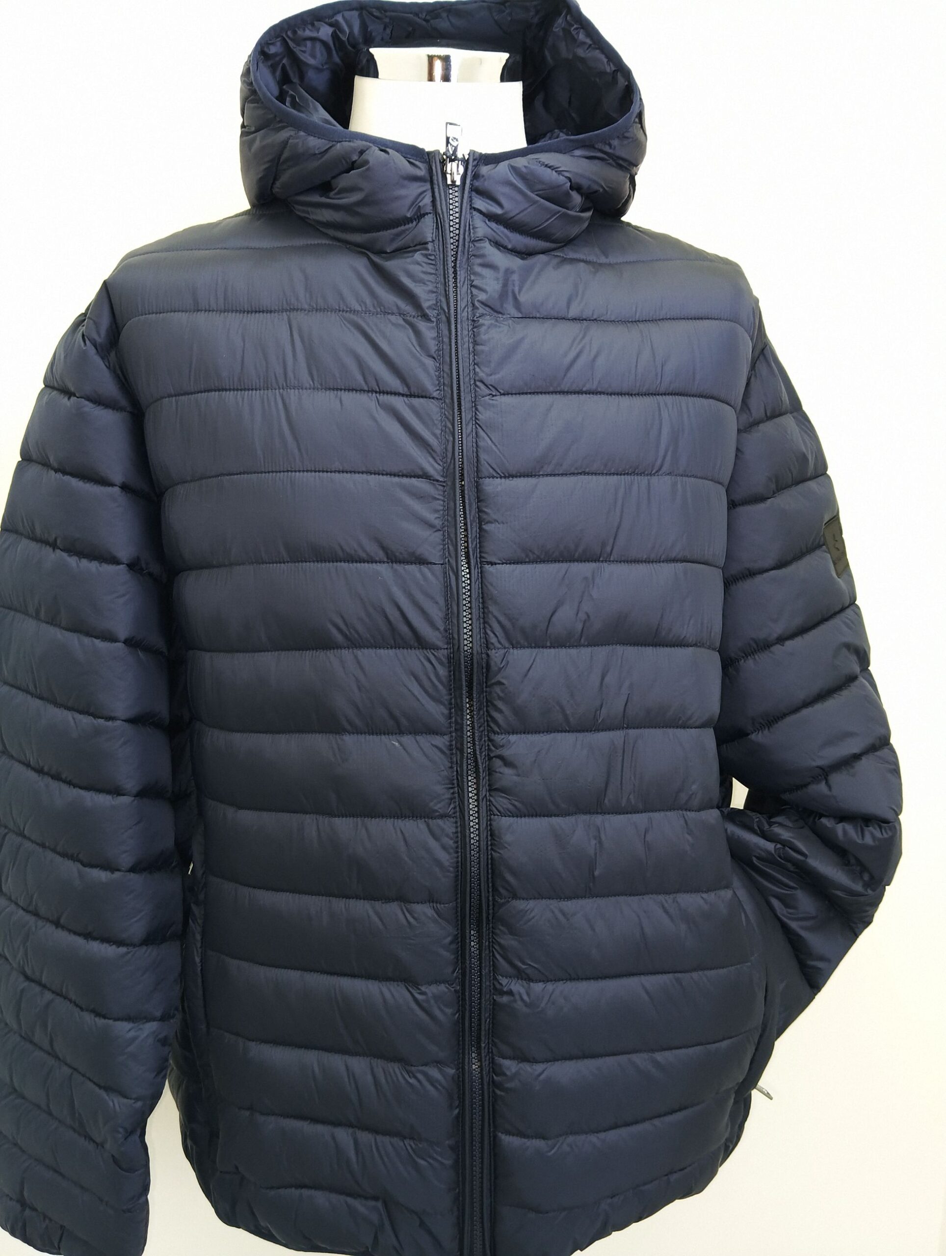 Piumino uomo 100grammi in eco-piuma con effetto lucido cappuccio integrato cerniera doppio cursore e tasche chiuse con zip logo sul braccio