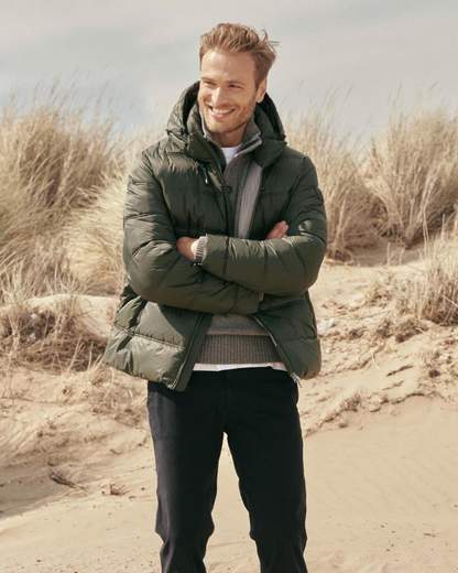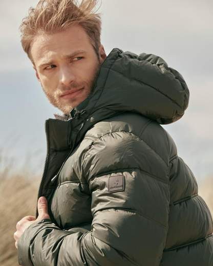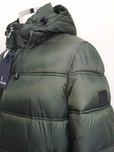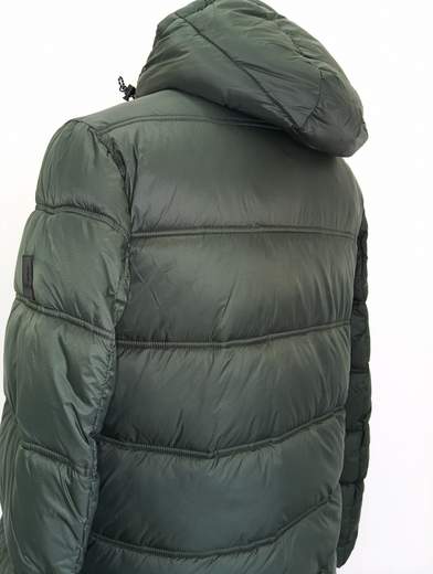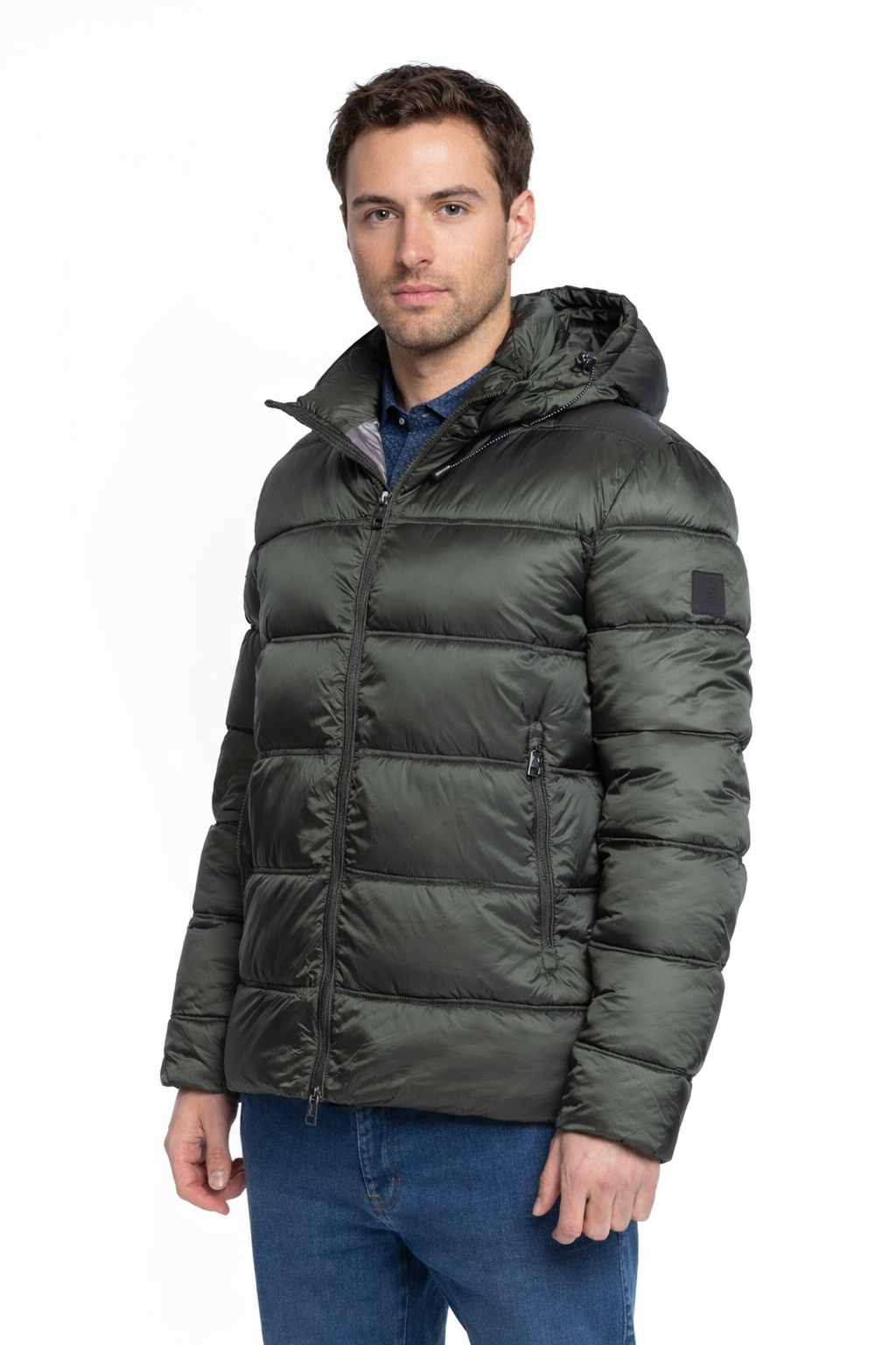 Piumino uomo tessuto lucido chiusura con cerniera doppio cursore cappuccio staccabile regolabile coulisse ai fianchi logo sul braccio tasche chiusura zip imbottitura in ecopiuma