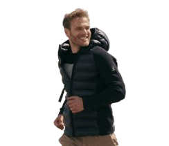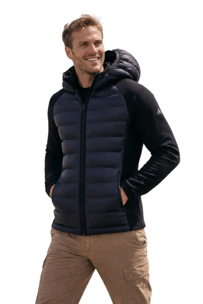 Piumino modello bomber con maniche in maglia cappuccio integrato inserto in maglia anche ai fianchi per un maggior comfort chiusura cerniera doppio cursore tasche con cerniere nascoste