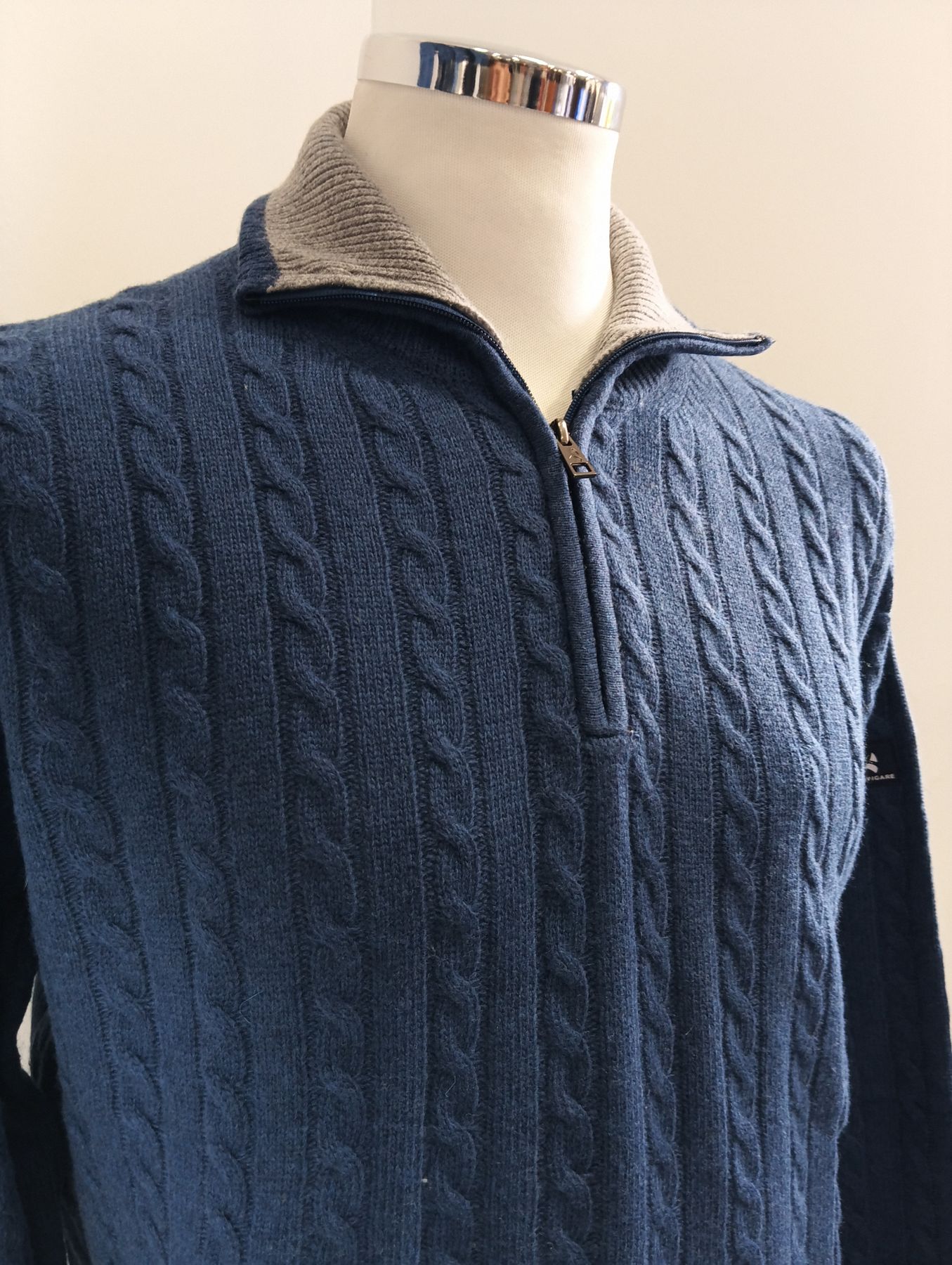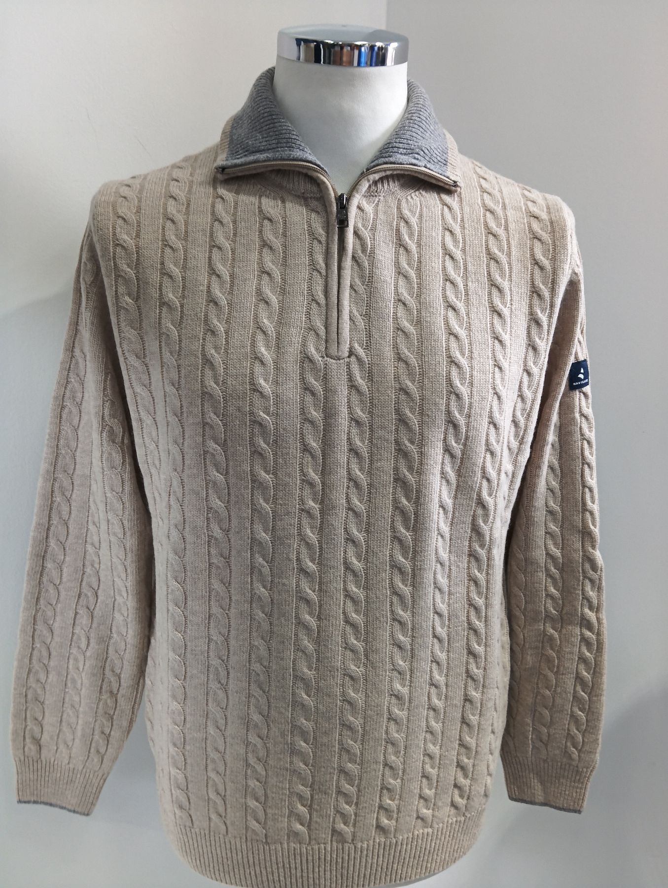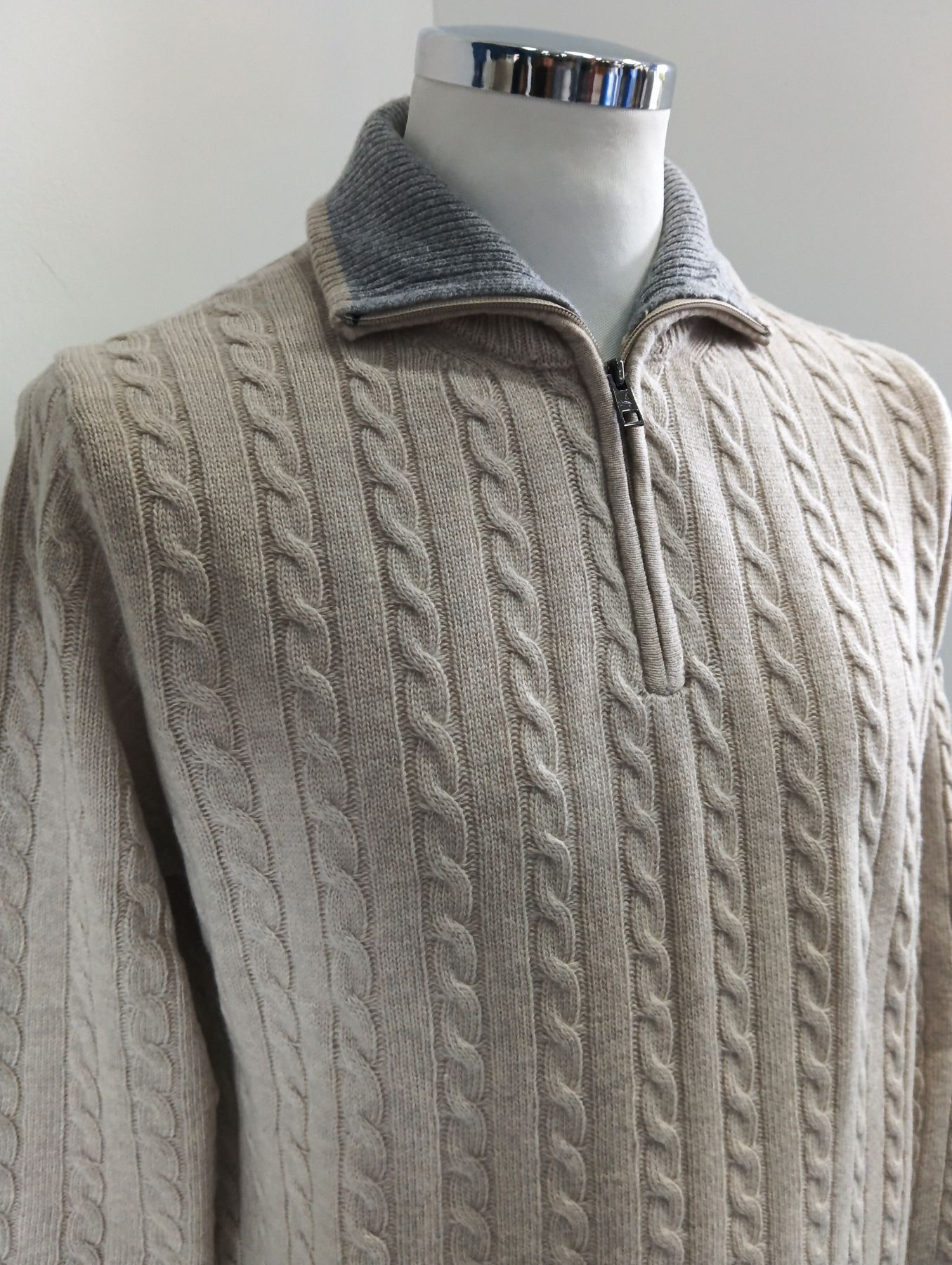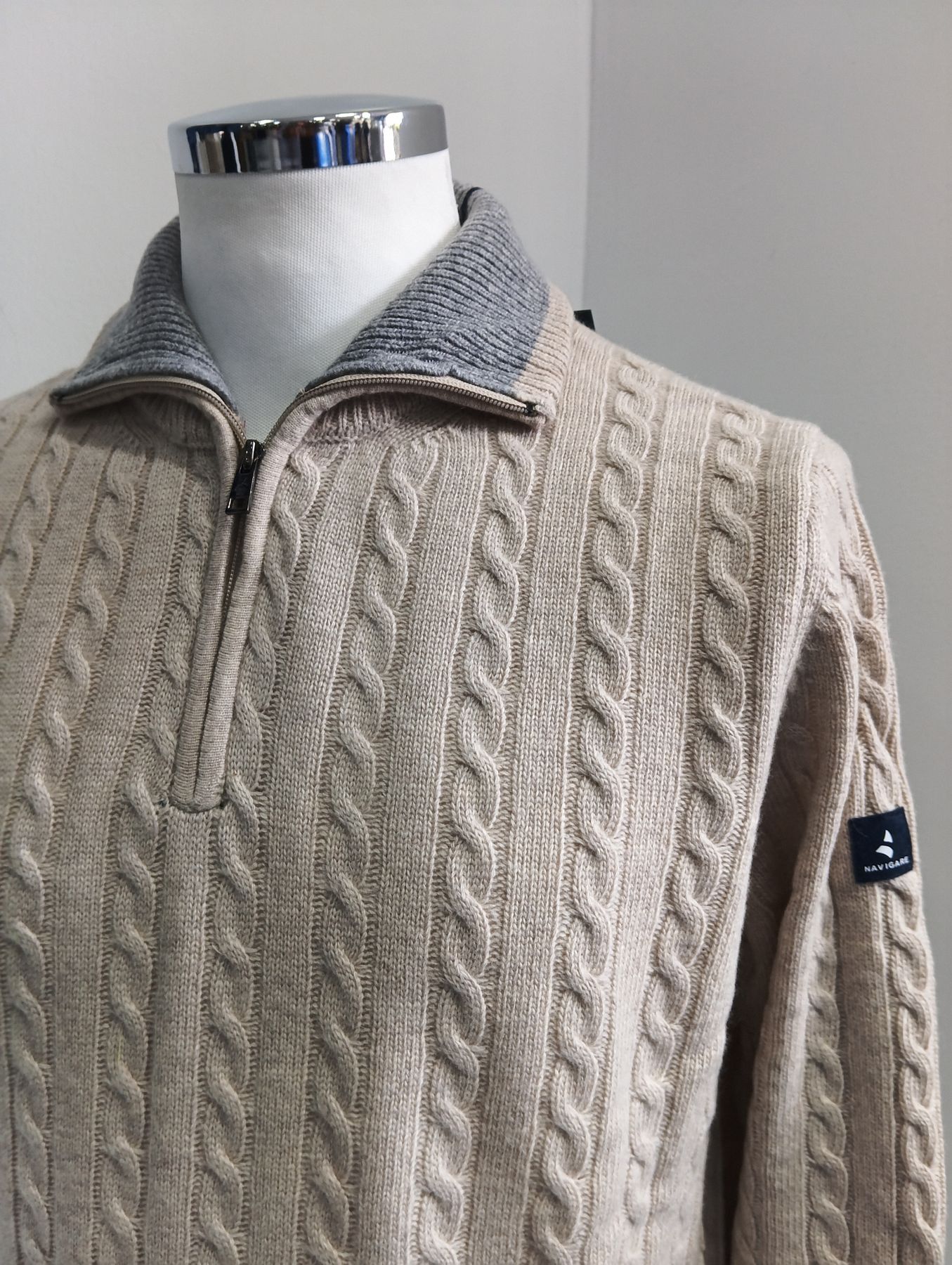 Maglione uomo in lana polo con zip lavorazione a trecce e logo sul braccio