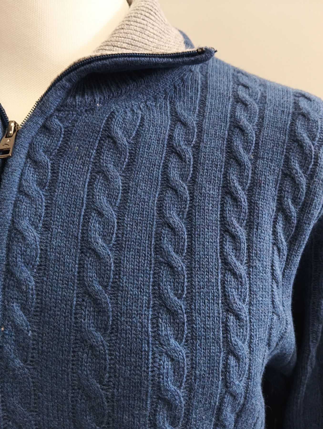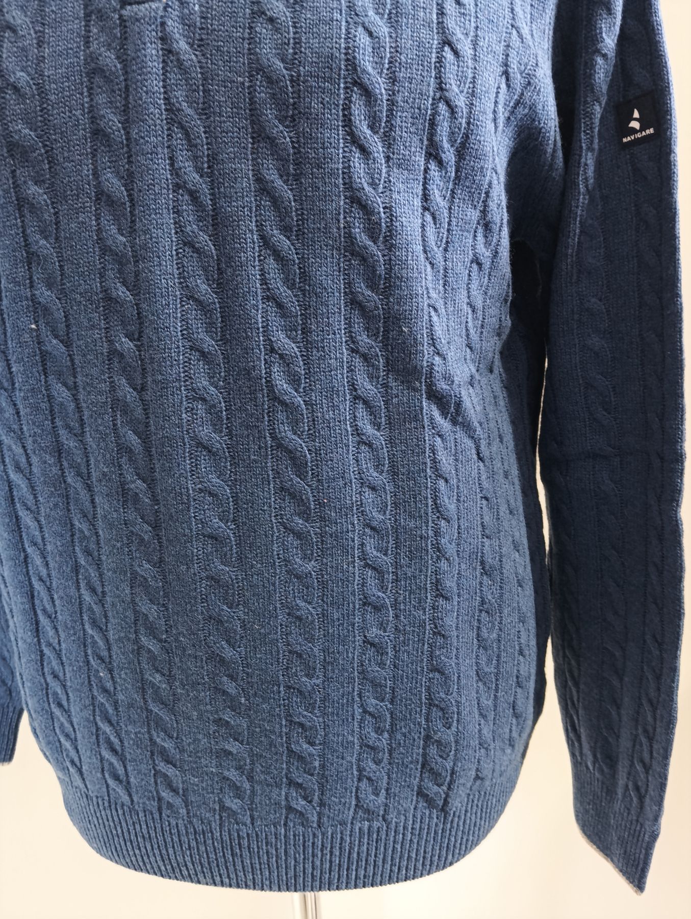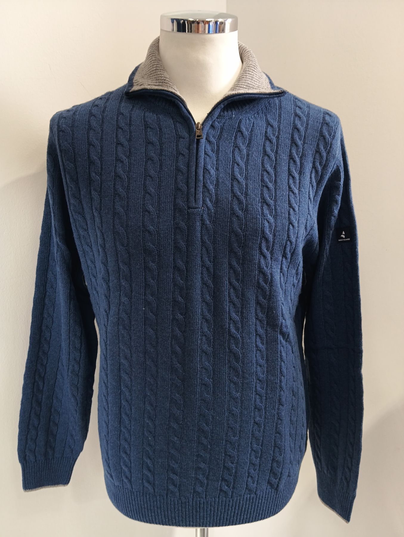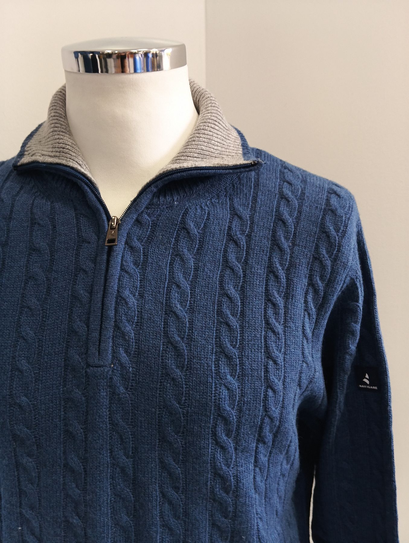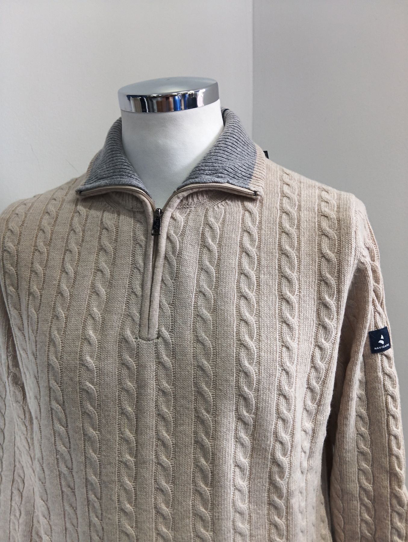 Maglione uomo in lana polo con zip lavorazione a trecce e logo sul braccio