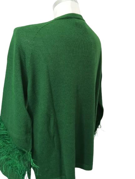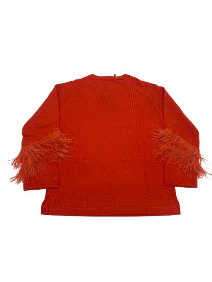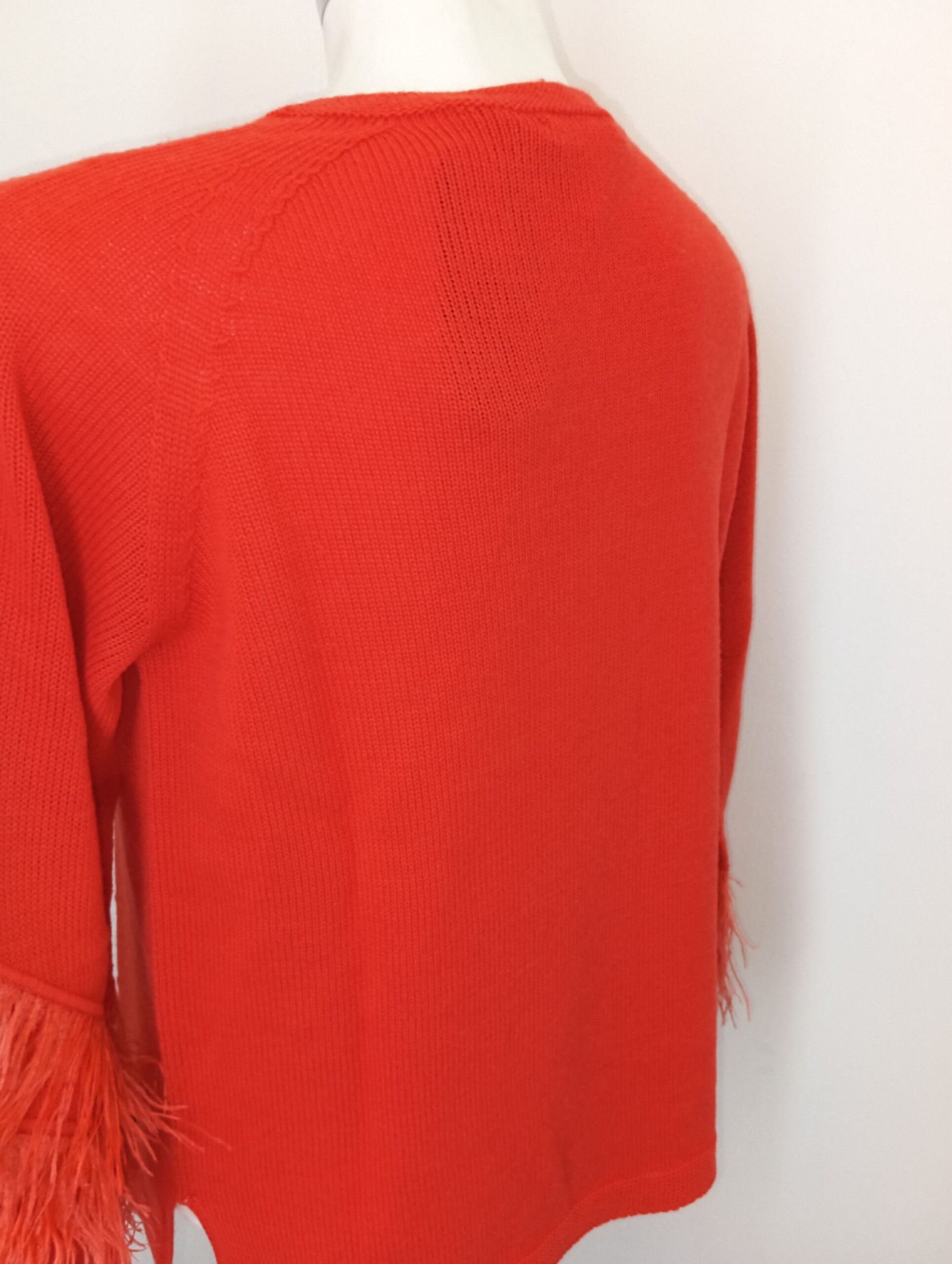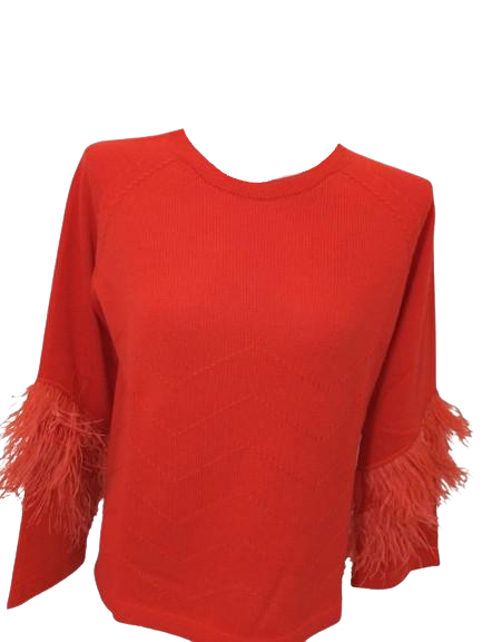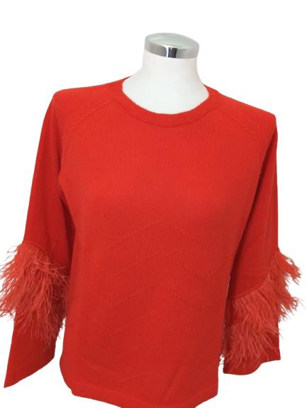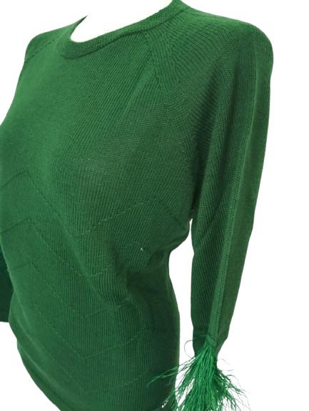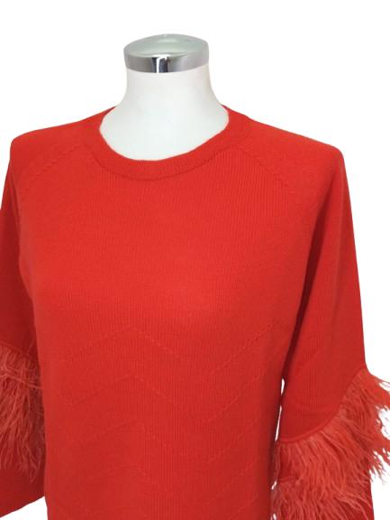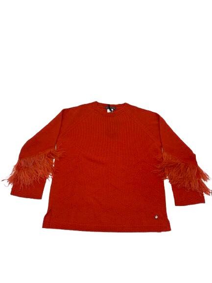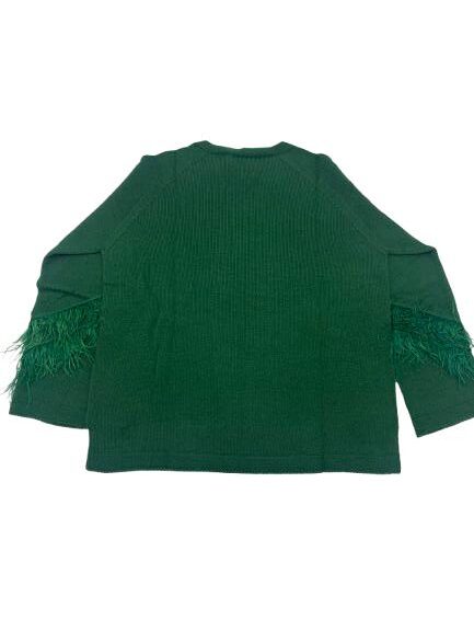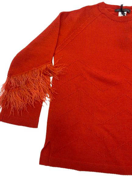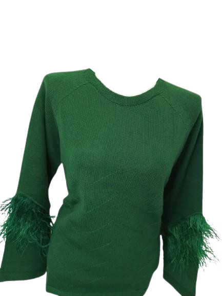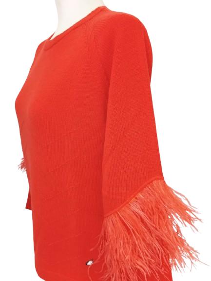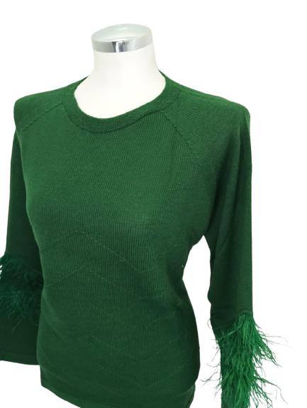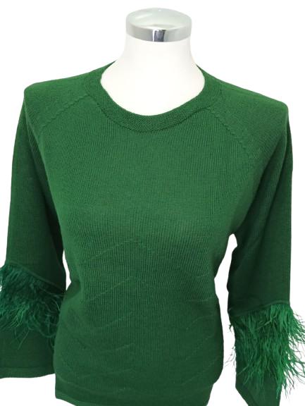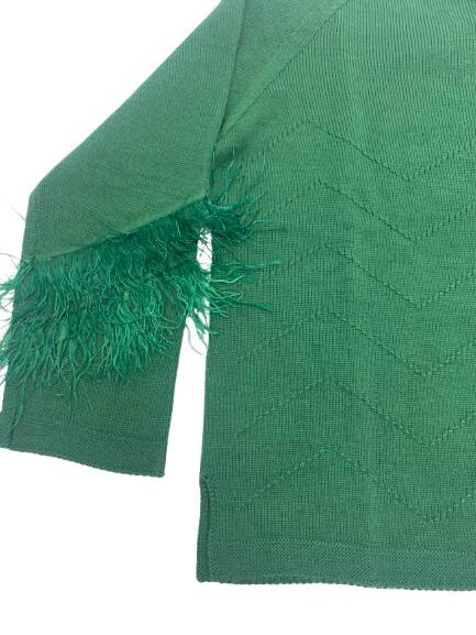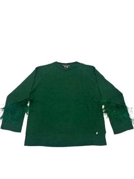 Maglione donna collo a barca con intarsio tinta su tinta e inserto piume sulle maniche misto lana